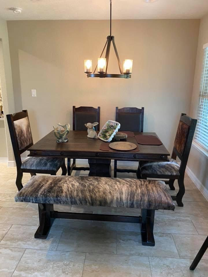 Comedor con banca para 6 personas, top liso, con el mejor toque rústico moderno, un pedestal, doble moldura con chapetón.